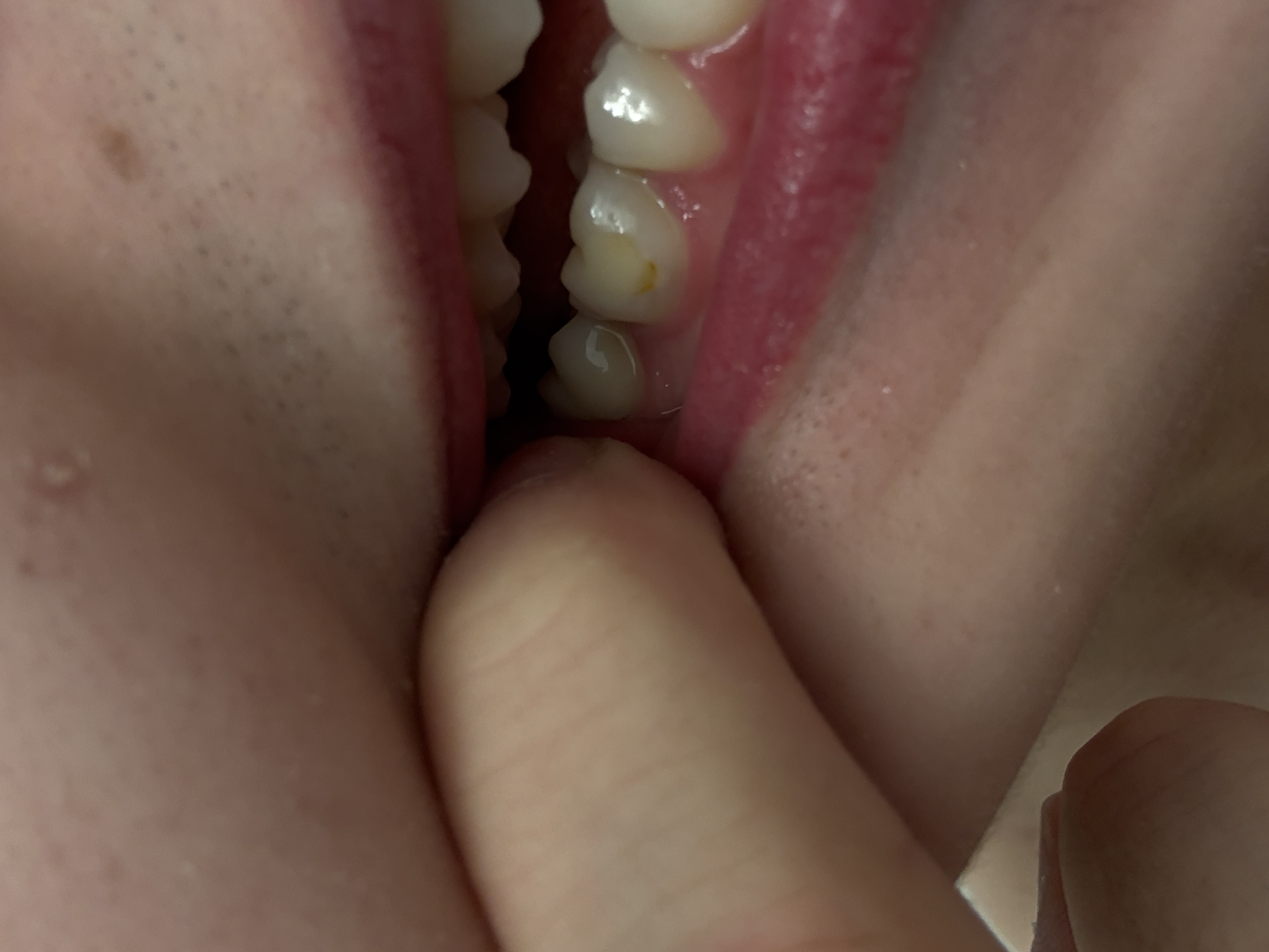 Die verfärbte Stelle liegt etwas tiefer als die Zahnoberfläche, als ob mir dort ein kleines Stück Zahn fehlen würde.