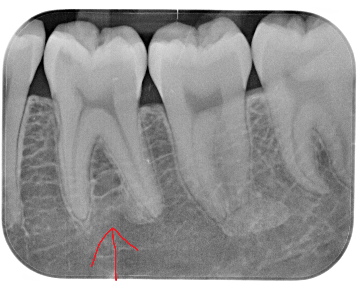 für mich sieht es so aus als hätte ich am markierten Zahn links unter dem Höcker eine schon bis ins Dentin fortgeschrittene Karies. Mein Zahnarzt hat jedoch dazu nichts gesagt. Es ist ja eine deutliche Verdunklung zu sehen, jedoch sehe ich nicht diese typische dreieckige Eintrittsstelle. Im Panoramaröntgenbild sieht die Stelle schlimmer/deutlicher aus als in der Bissflügelaufnahme.