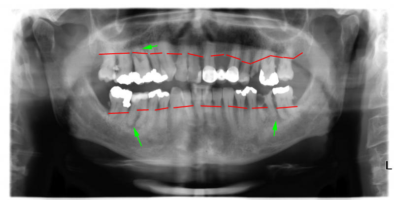 bei dir ist er unterhalb des wurzelstammes, deswegen sind die furkationen vermutlich alle offen. dazu paßen auch die beherdungen (grüne pfeile). die aufzählung der wurzelreste und des massiven zahnsteines habe ich mir erspart, denn das sieht sogar steve wonder und da du dich ja soviel damit beschäftigt hast, wirst du es im röntgen auch sehen.